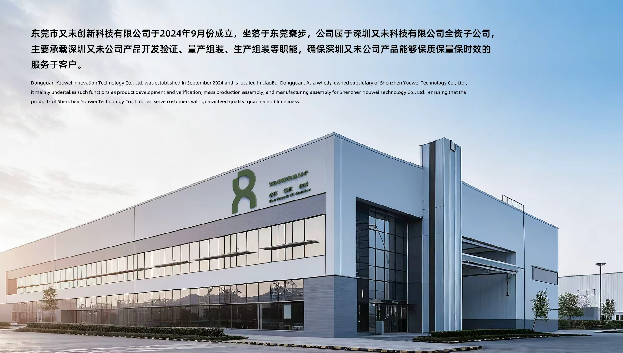 Dongguan Youwei innovation Technology Co., Ltd. was established in september 2024 and is located in Liaolu, Dongguan.As a wholly-owned subsidiary of Shenzhen Youwei Technology Co., Ltd., it mainly undertakes such functions as product development and verification, mass production assembly, and manufacturing assembly for Shenzhen Youwei Technology Co., Ltd., ensuring that the products of Shenzhen Youwei Technology Co., Ltd. can serve customers with guaranteed quality, quantity and timeliness.
