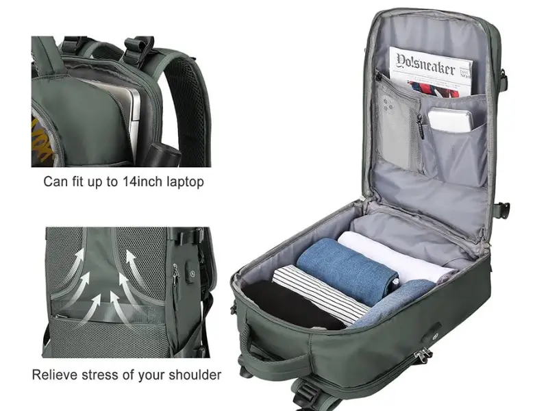 This backpack is made of wear-resistant and waterproof fabric, is lightweight and comfortable, and features a breathable back plate design to reduce the burden. With multiple compartments for storage and flexible capacity, it meets various needs such as commuting and traveling. With a fashionable appearance that combines practicality and beauty, it is your ideal companion for travel.