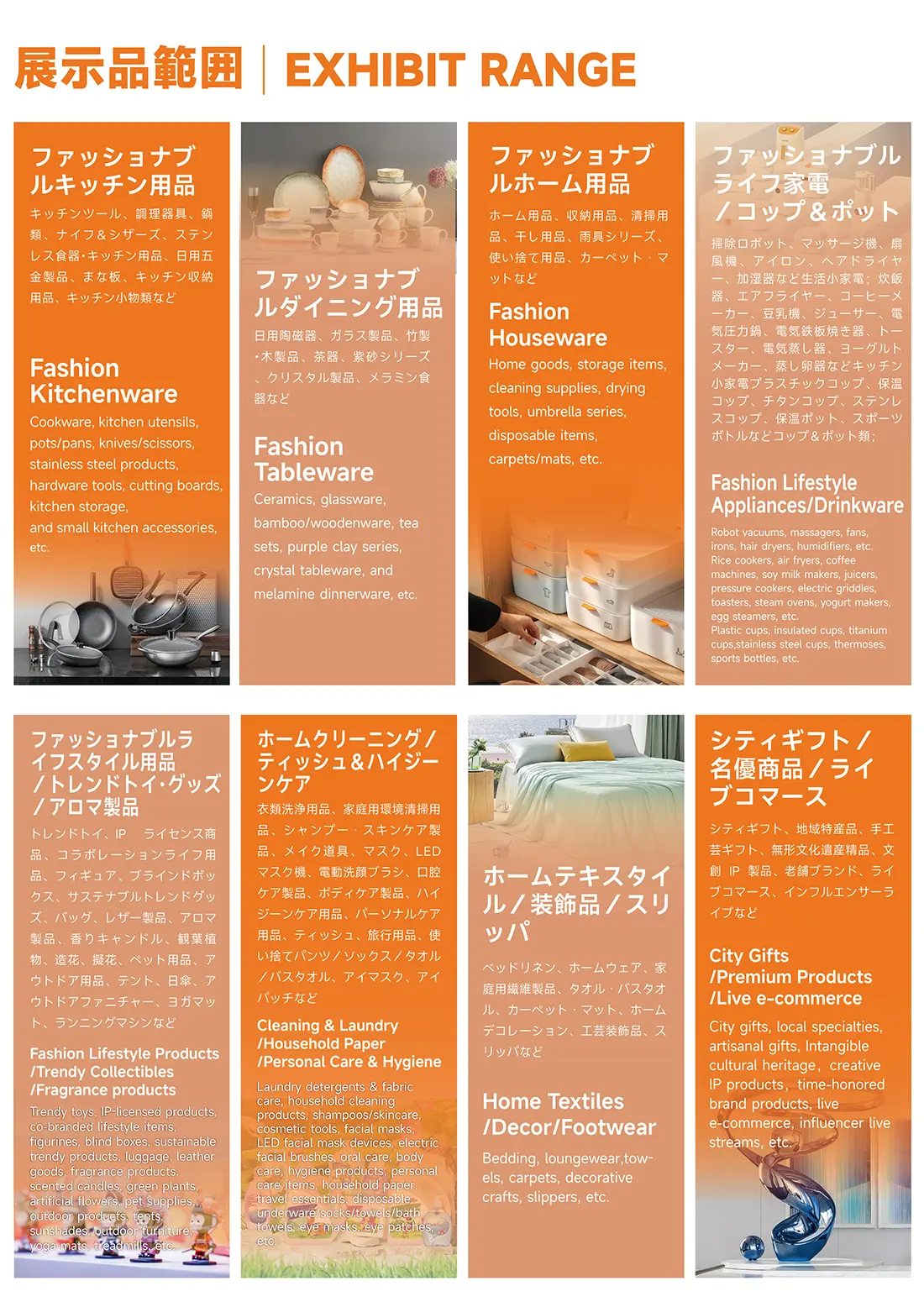 ファッショナブルなキッチン用品、ダイニング用品、モダンライフ家電/カップ&ポット、モダンライフ用品/トレンド玩具/アロマ製品、ファッショナブルな家居用品、家庭用洗剤/生活用品/衛生ケア、ホームファッション/装飾品/スリッパ、都市ギフト/名優商品/ライブコマースなどの関連ブランドを持つ企業が一堂に集結します。展示面積は10万平方メートルで、1500社以上の企業、6000以上のブランドが集まり、業界の新製品発表、ブランド展示、注文取引、インタラクティブ交流のためのB2Bビジネスプラットフォームを提供します。期間中には10回以上の活動が同時開催される予定で、業界のリーダーやホットトピックが集まり、業界の革新思考を牽引し、業界内のビジネスパートナーに高い価値の意思決定参考を提供することを目指しています。家居業界とモダンライフスタイル業界で最も革新的で活力のある産業チェーンエコシステムプラットフォームを構築することを目指しています。