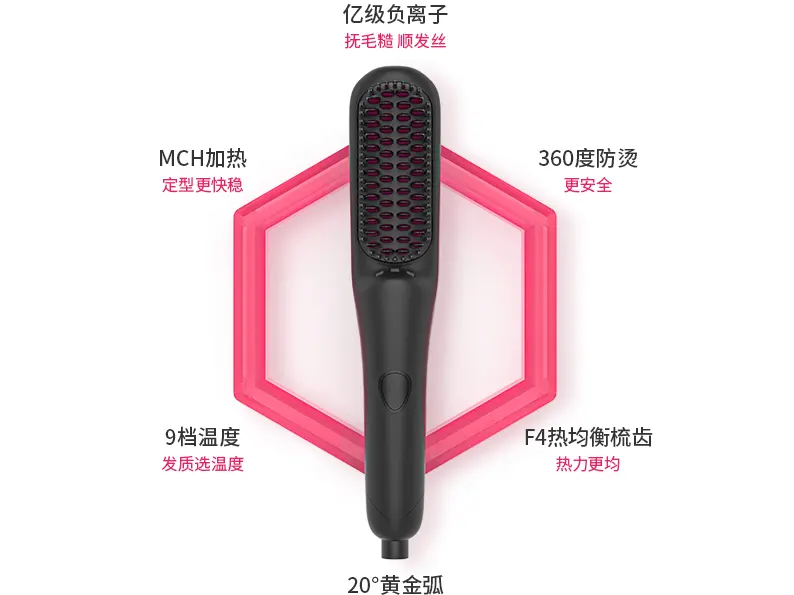 3.360°双重防烫,机体采用防-热-防的双防模式,梳齿采用内外全包隔热,尽可能避免烫伤。
