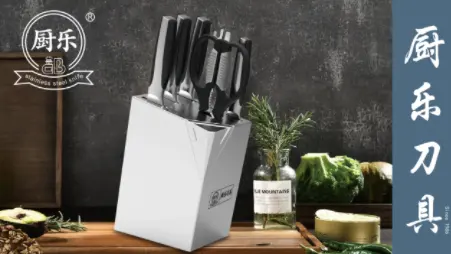 配置:砍骨刀、切片刀、小厨刀、水果刀、厨房剪、磨刀器、木座。