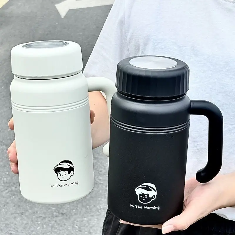 这是一款大容量保温杯,有黑白两种配色,设计简约又带点可爱的卡通元素。